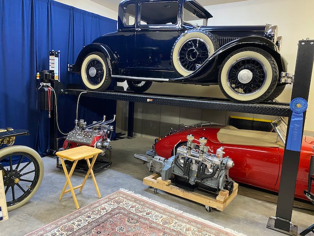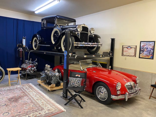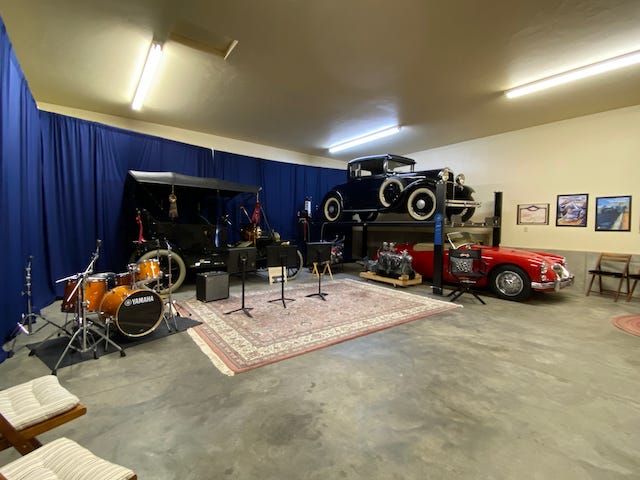 We moved the vehicle lift to one side with the 29 Dodge (gift from my Dad when I was in junior high school) and placed the 62 MGA under it to provide some color. David provided his drum set. The engine next to the MGA will be going into the 29 Dodge later this year.