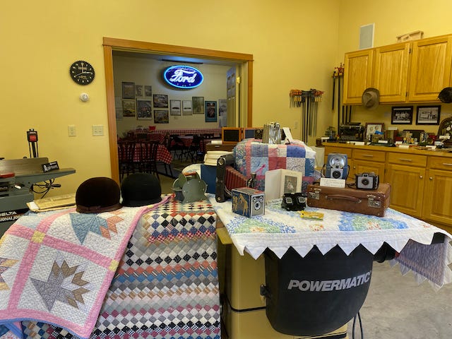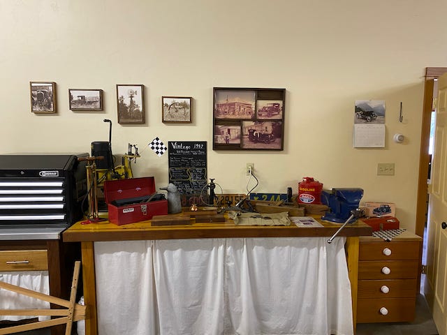Mary Ellen even made my shop benches look good with some old tools and pictures.