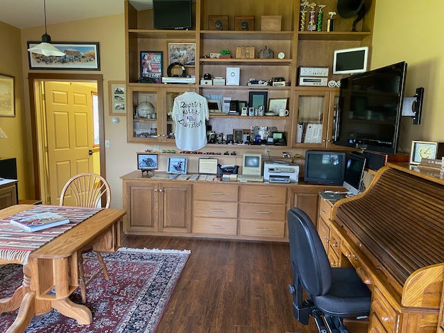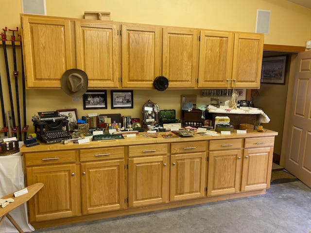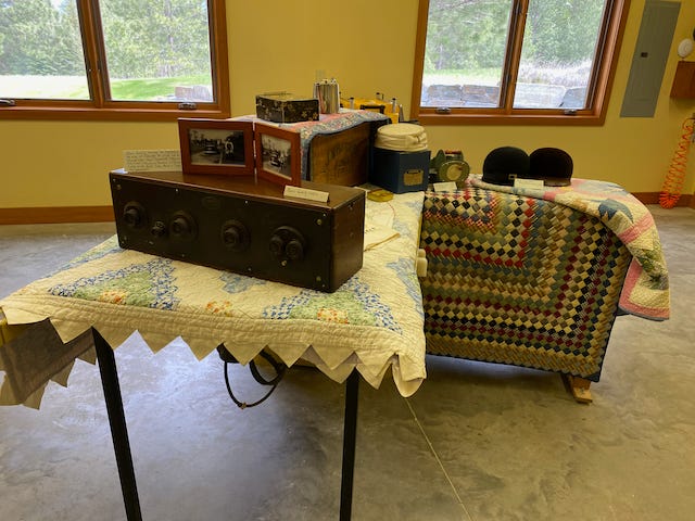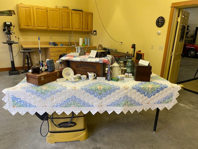 Mary Ellen also set up a vintage display in the wood shop and office of the barn for everyone to enjoy. Found stuff from when I was drag racing my Honda in Lewistown during high school, jewelry and clothes from our family, a picture from our second date at MSU in 1966, and technical stuff from my career at Hughes Aircraft and Motorola.