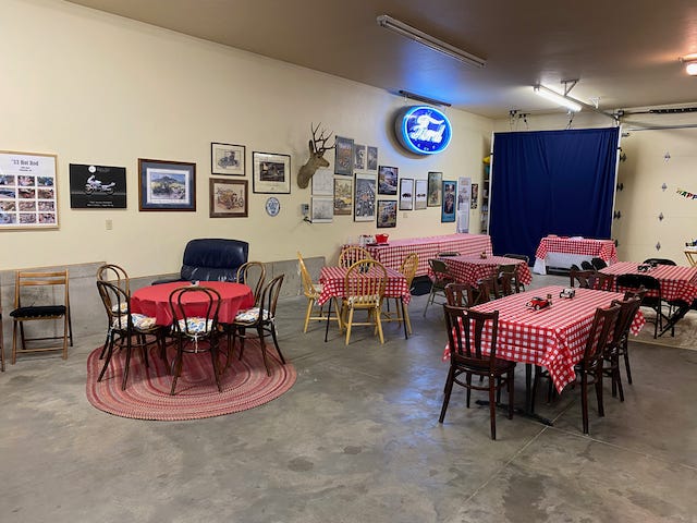 We had tables set up so everyone could sit down with their food and enjoy the jazz band. There are a few pictures on the wall under the thirties Ford sign acquired at Barrett-Jackson a few years ago.